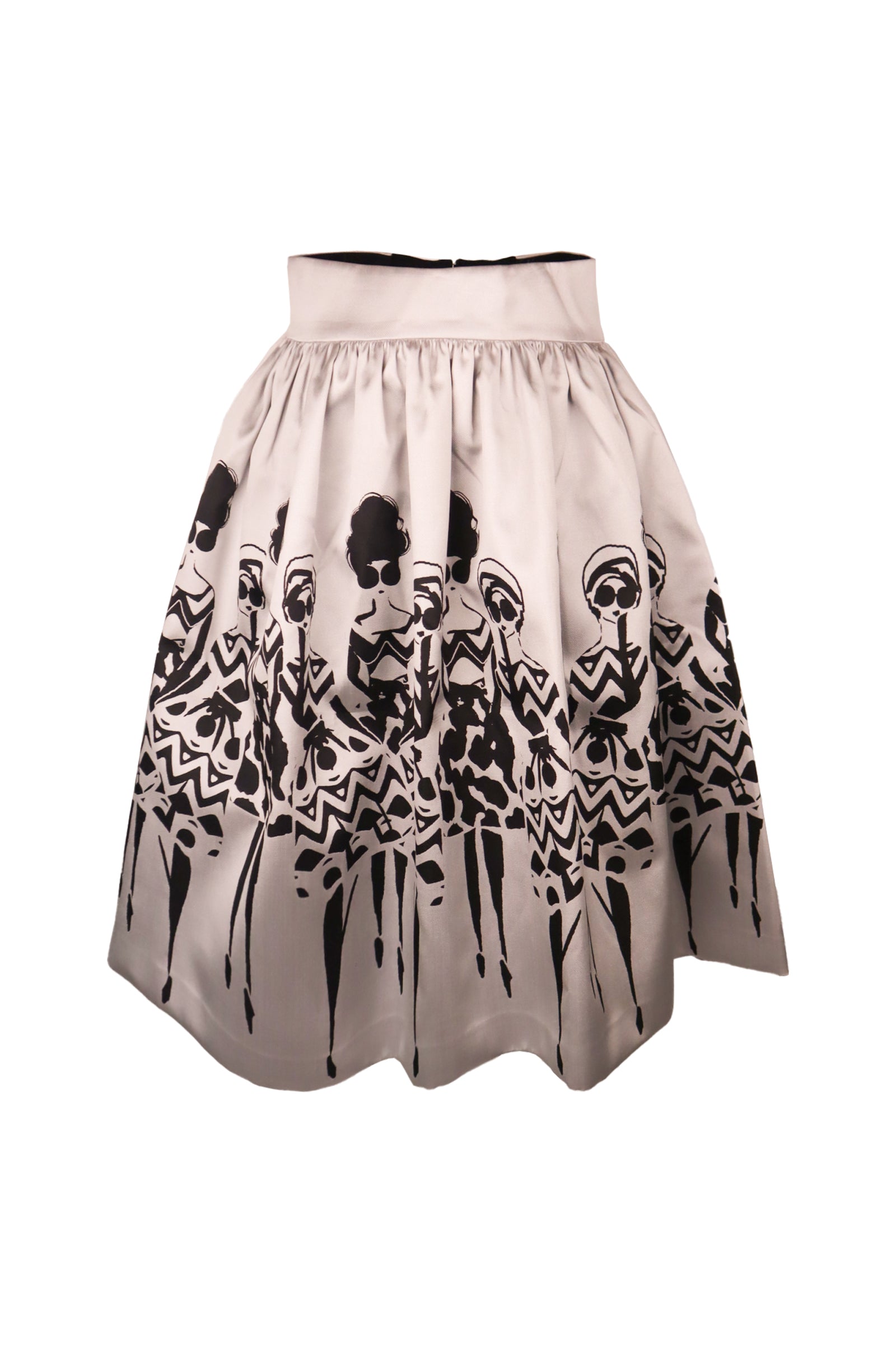 An Alice + Olivia regular-fit skirt from the mid-2010s, designed with a bold black graphic print on a white base and a sculptural balloon silhouette.