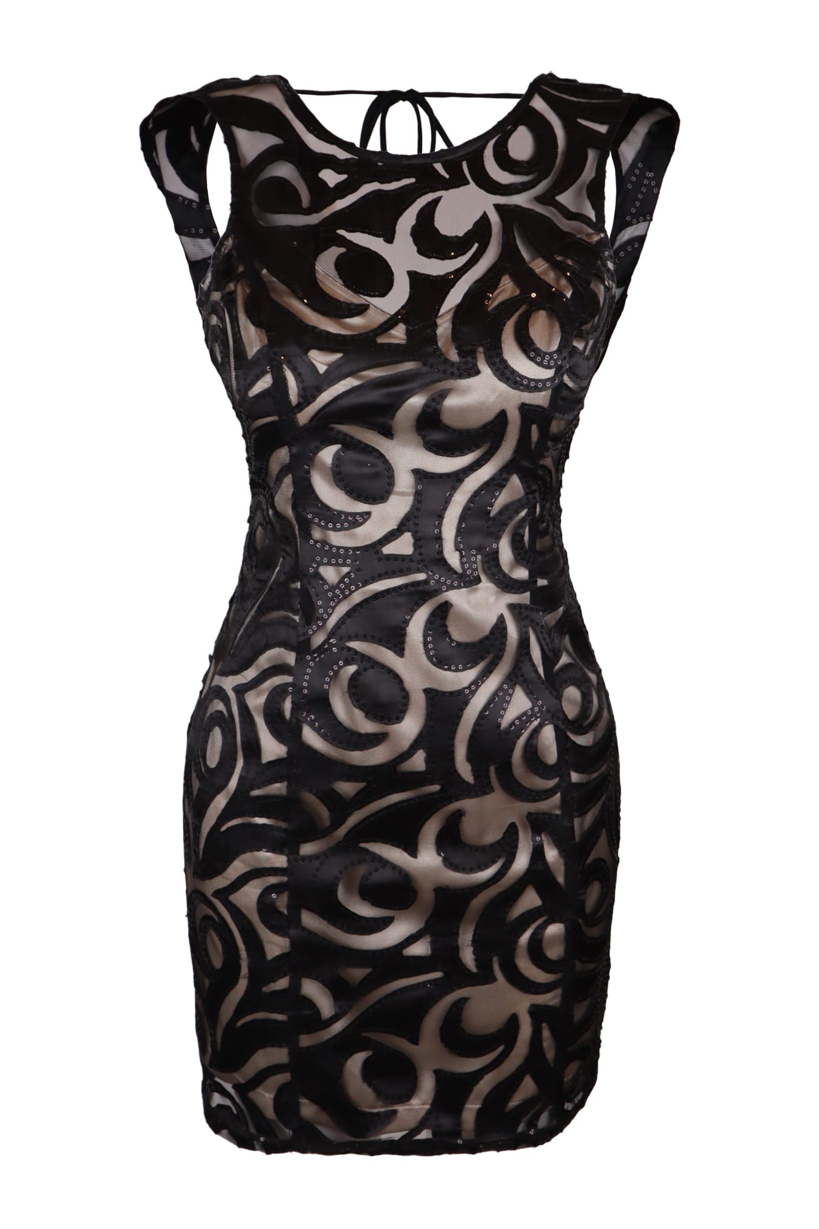 Fitted mini dress crafted from sheer mesh with an all-over black swirl appliqué pattern layered over a nude-toned base. Designed with a sleeveless cut and a clean front silhouette, while the back features a deep V-shaped open detail with tie closure and a central zipper for a structured fit. The swirling motifs add texture and movement, giving the dress a bold yet refined finish.