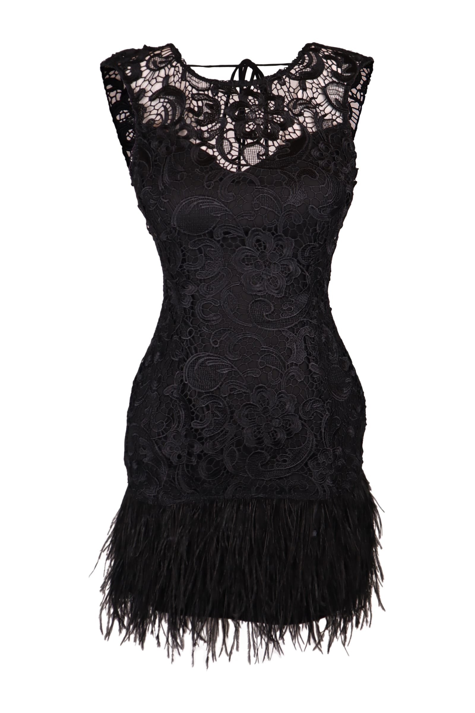 A Lipsy regular-fit mini dress from the 2012–2015 period, designed with a black lace construction and feather-trimmed detailing for a dramatic cocktail silhouette.