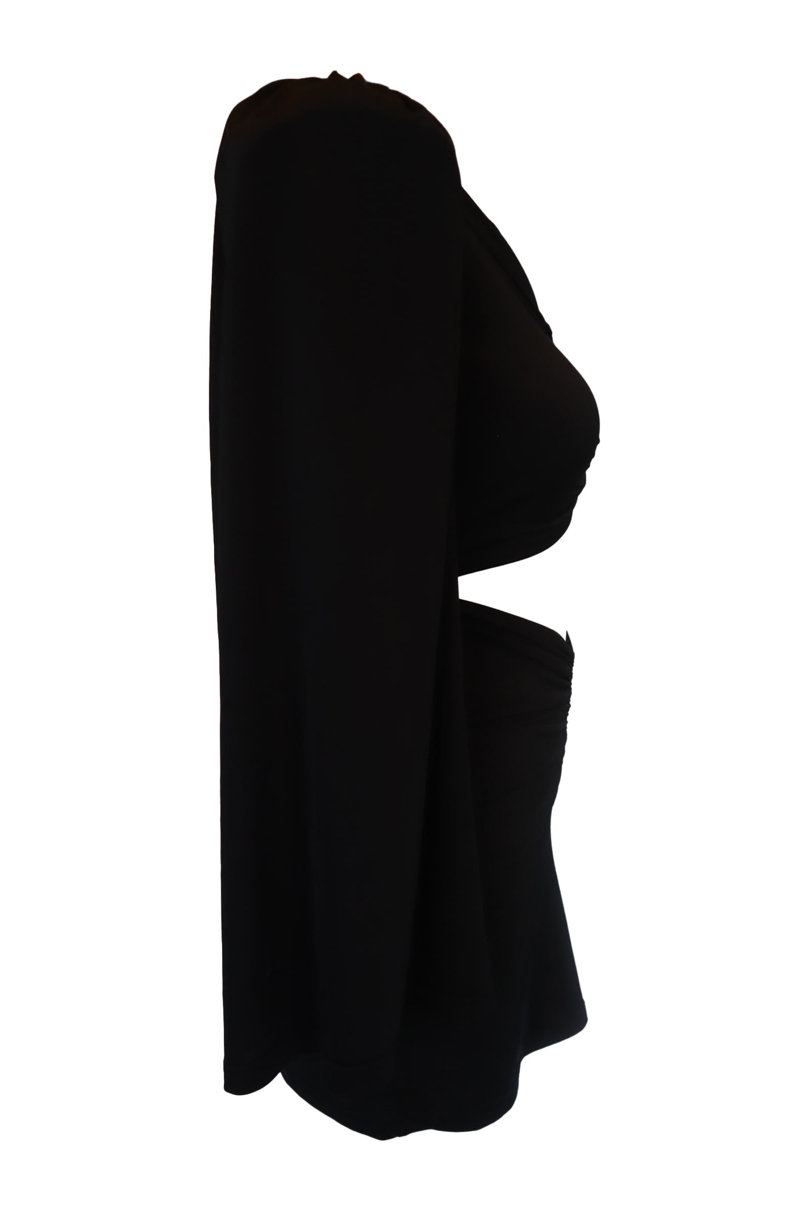 This dress features a regular fit with a mini length and a striking one-shoulder design. The silhouette includes a dramatic long sleeve on one side and a clean cut-out detail that adds contrast and structure. The minimalist black finish keeps the look refined while maintaining a bold, contemporary edge suitable for cocktail wear.
