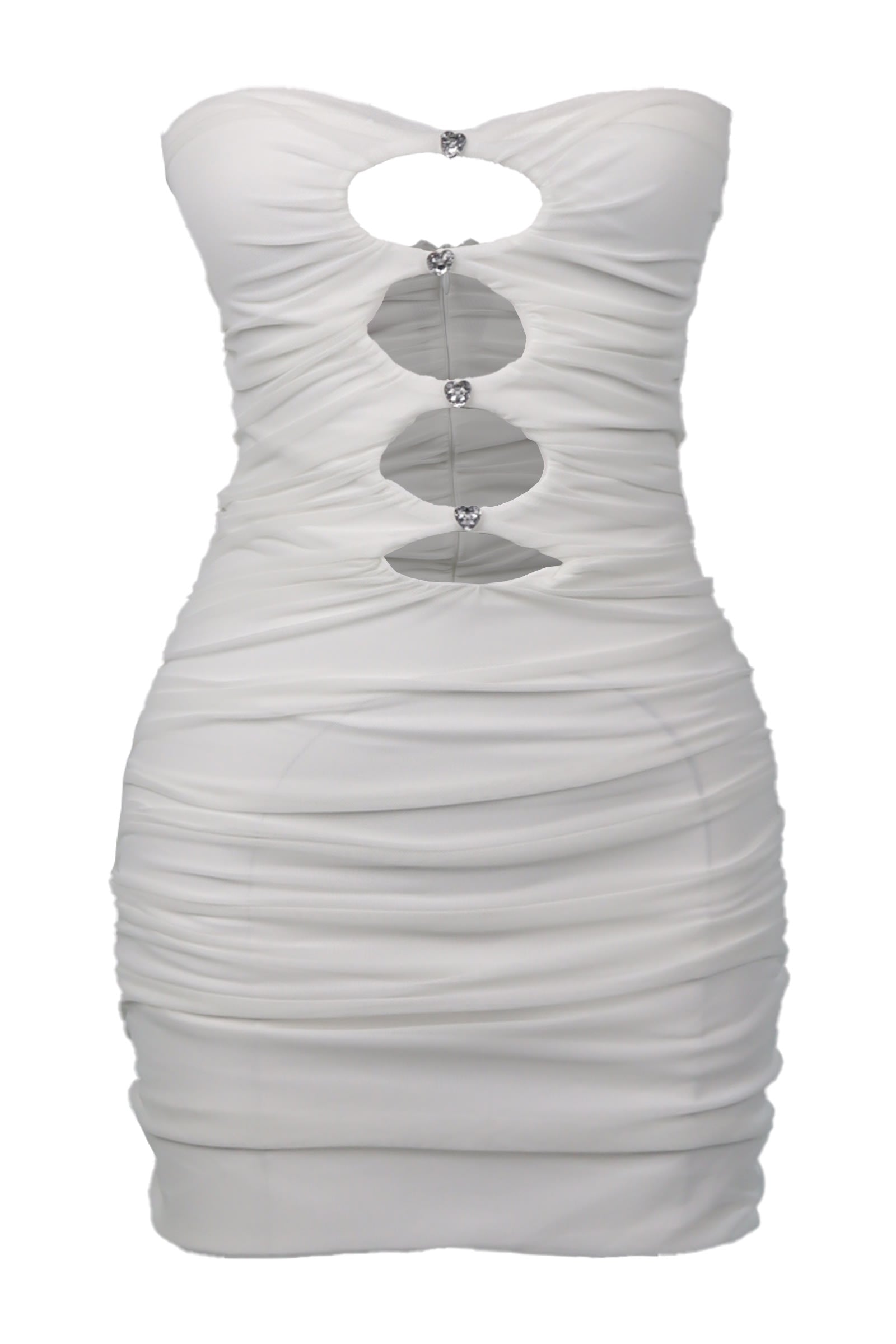 This dress features a slim fit with a mini length and a softly draped silhouette. Designed with cut-out details at the front, it is accented with small heart-shaped stone embellishments that add a subtle decorative touch. A concealed zipper at the back ensures a clean and seamless finish, making the piece suitable for modern cocktail styling.