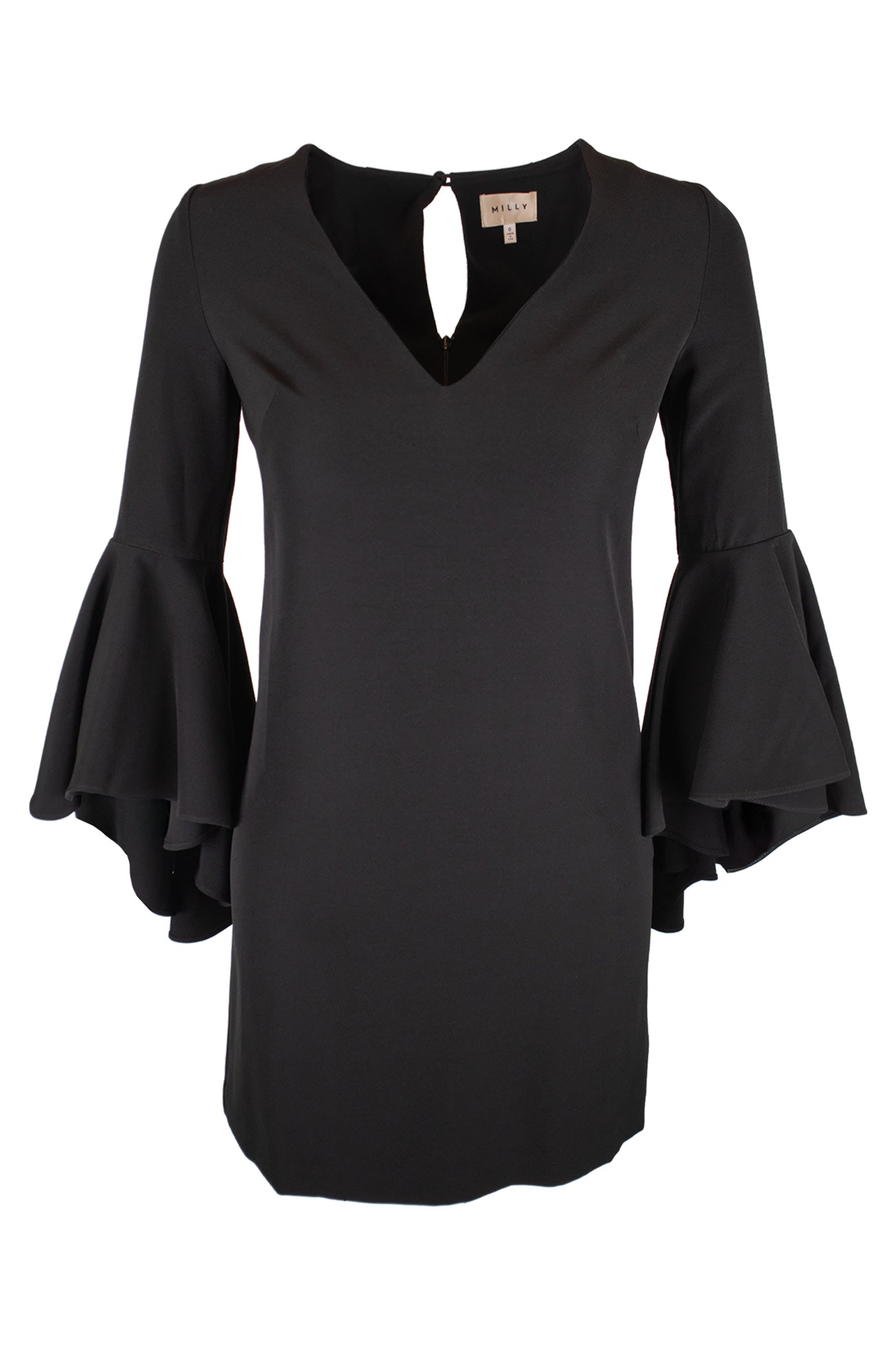 A Milly regular-fit mini dress from the 2016–2019 period, designed with a black structured fabric construction and flared sleeve detailing.