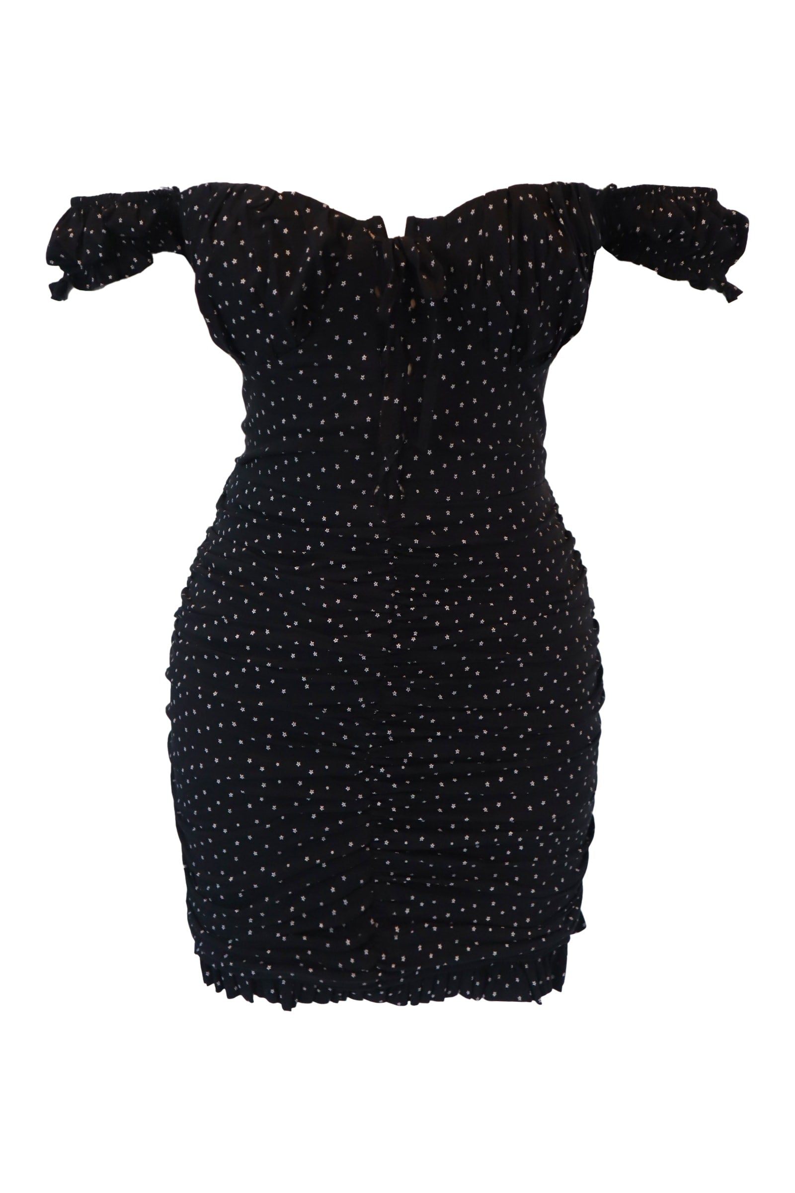 A Naia regular-fit mini dress from 2022, designed with a black cotton-blend fabric featuring white star polka-dot detailing and an off-shoulder silhouette.