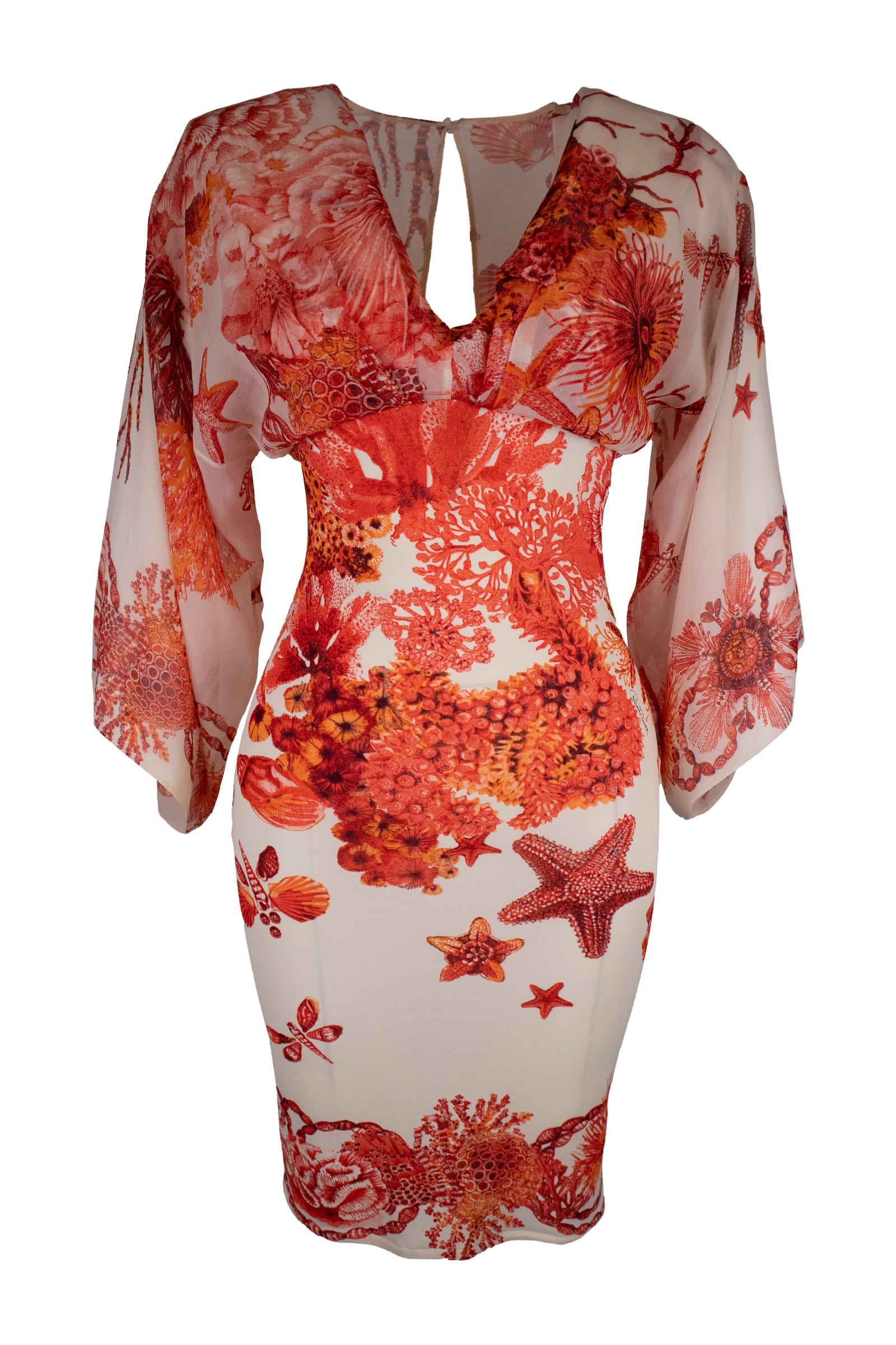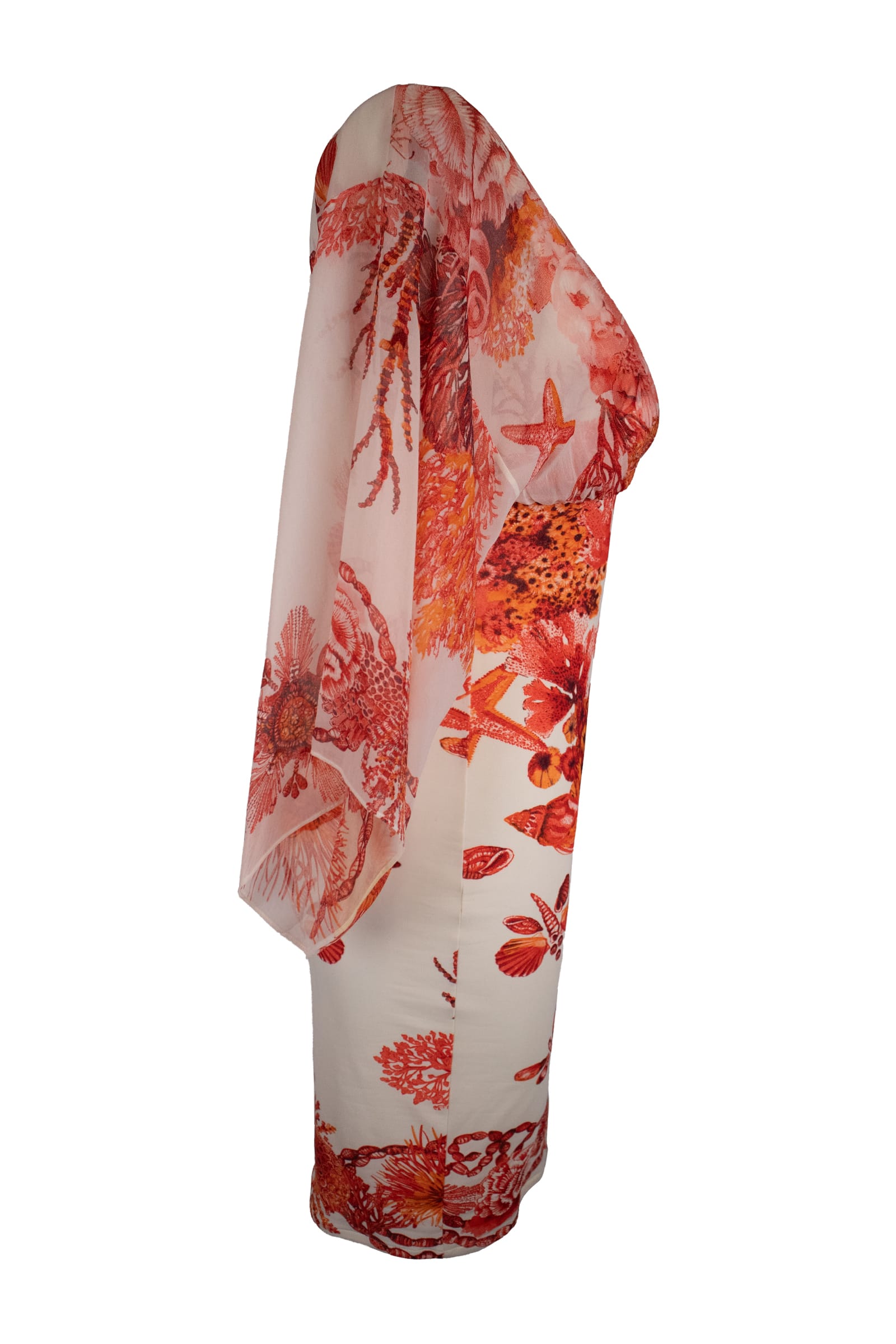 A Roberto Cavalli regular-fit mini dress from the mid to late 2010s, designed with a white base featuring orange and red coral motifs and a fluid chiffon-and-jersey construction.