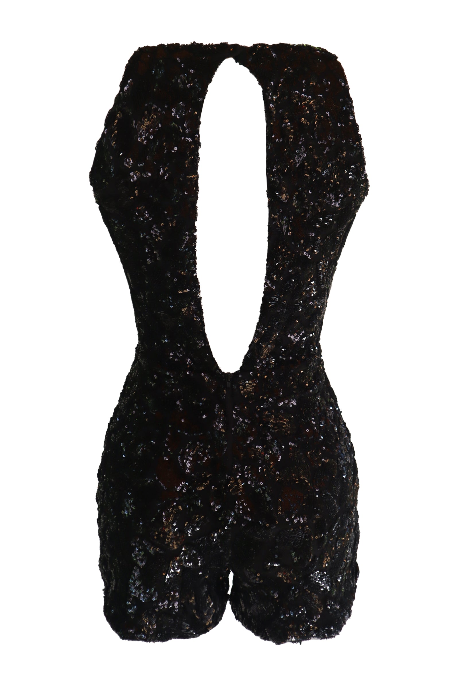Miss Selfridge Black Sequined Cutout Romper + high-neck halter design with a center cut-out décolletage + The backless cutout design + nape with a delicate button closure + side zipper