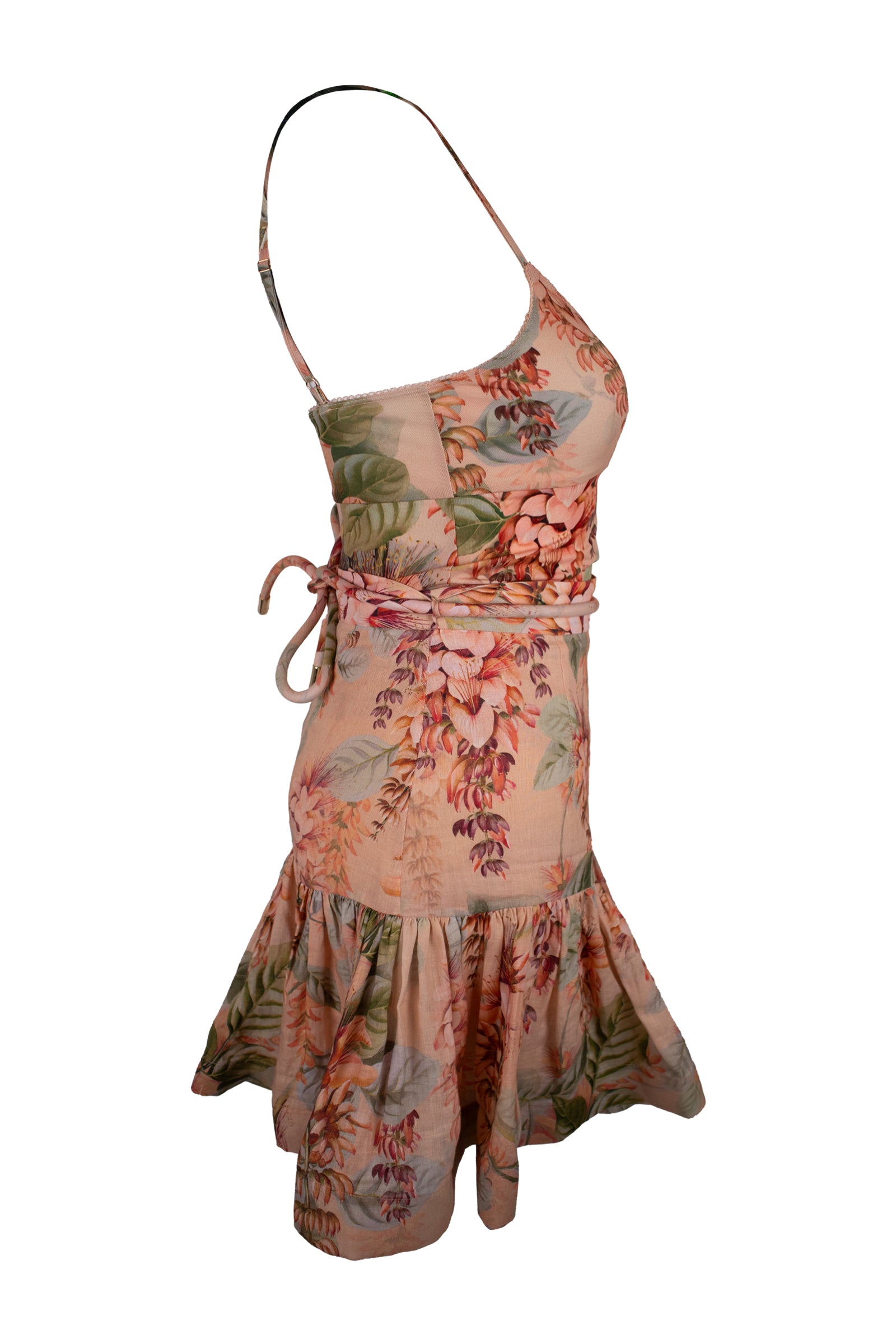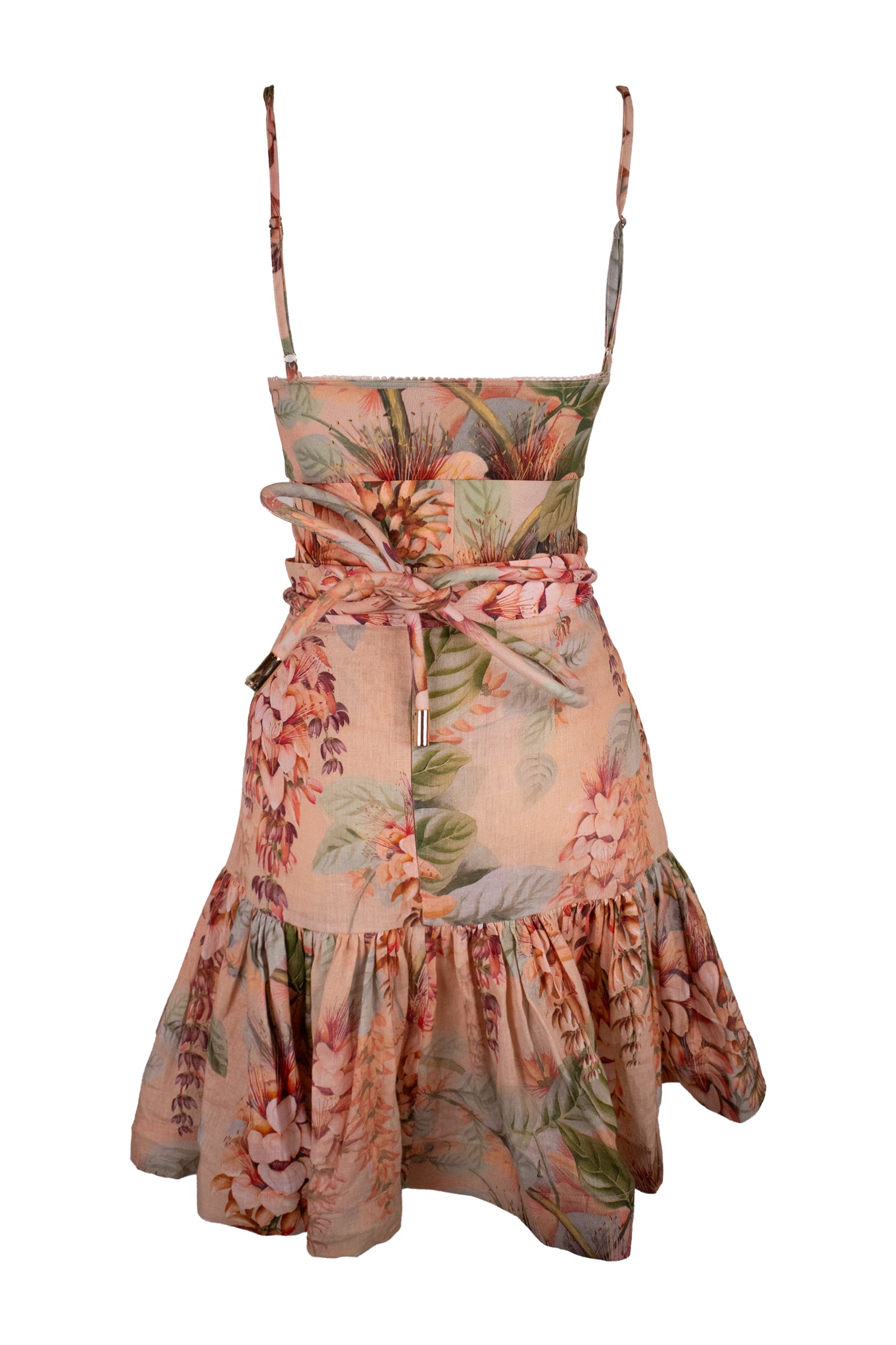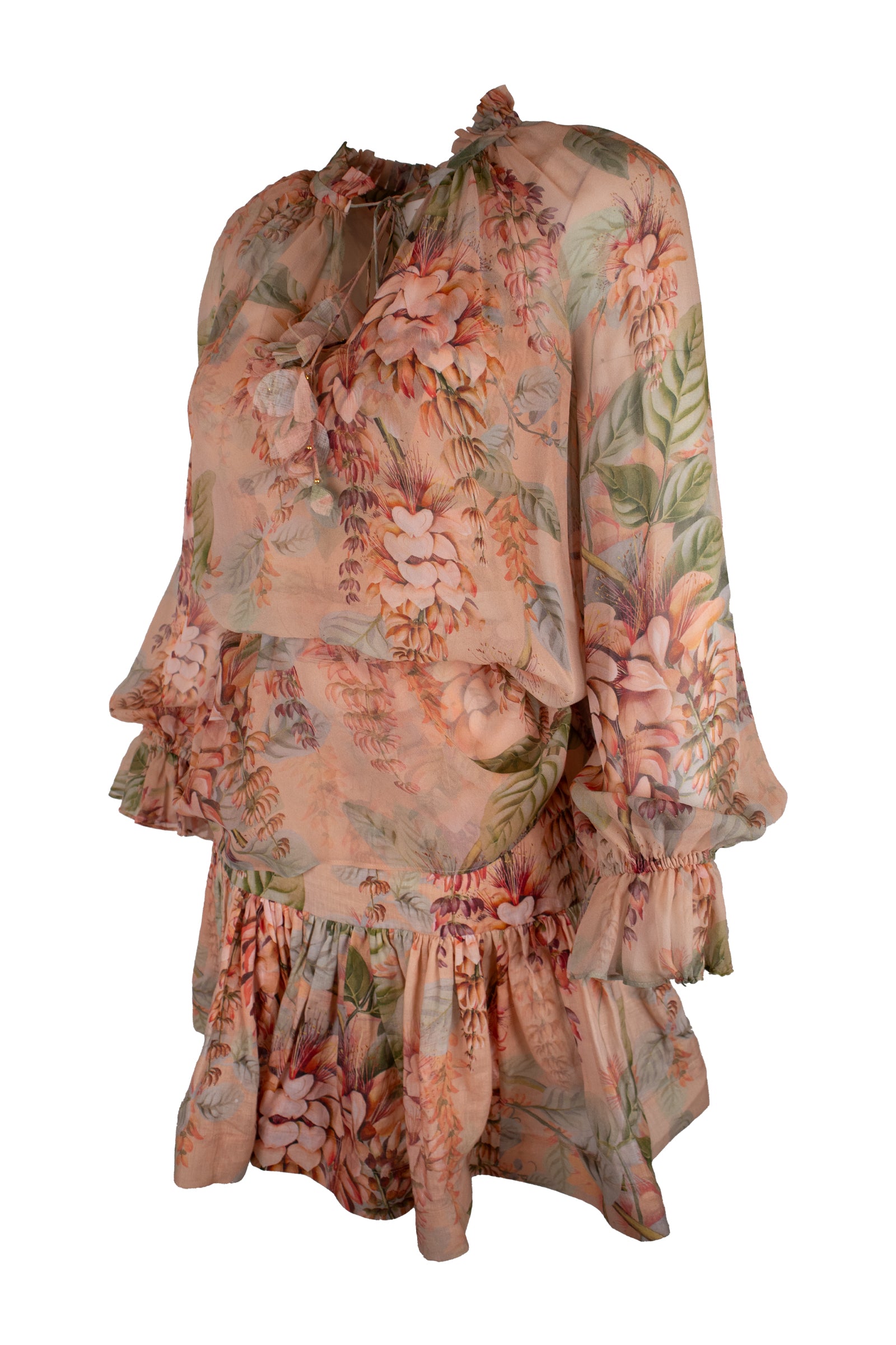 Zimmermann Floral Three-Piece Set delicate floral design + fitted tank top + a sheer long-sleeved blouse with tie-front detailing + a voluminous pleated skirt with a cinched waist. The back zipper closure and waist tie