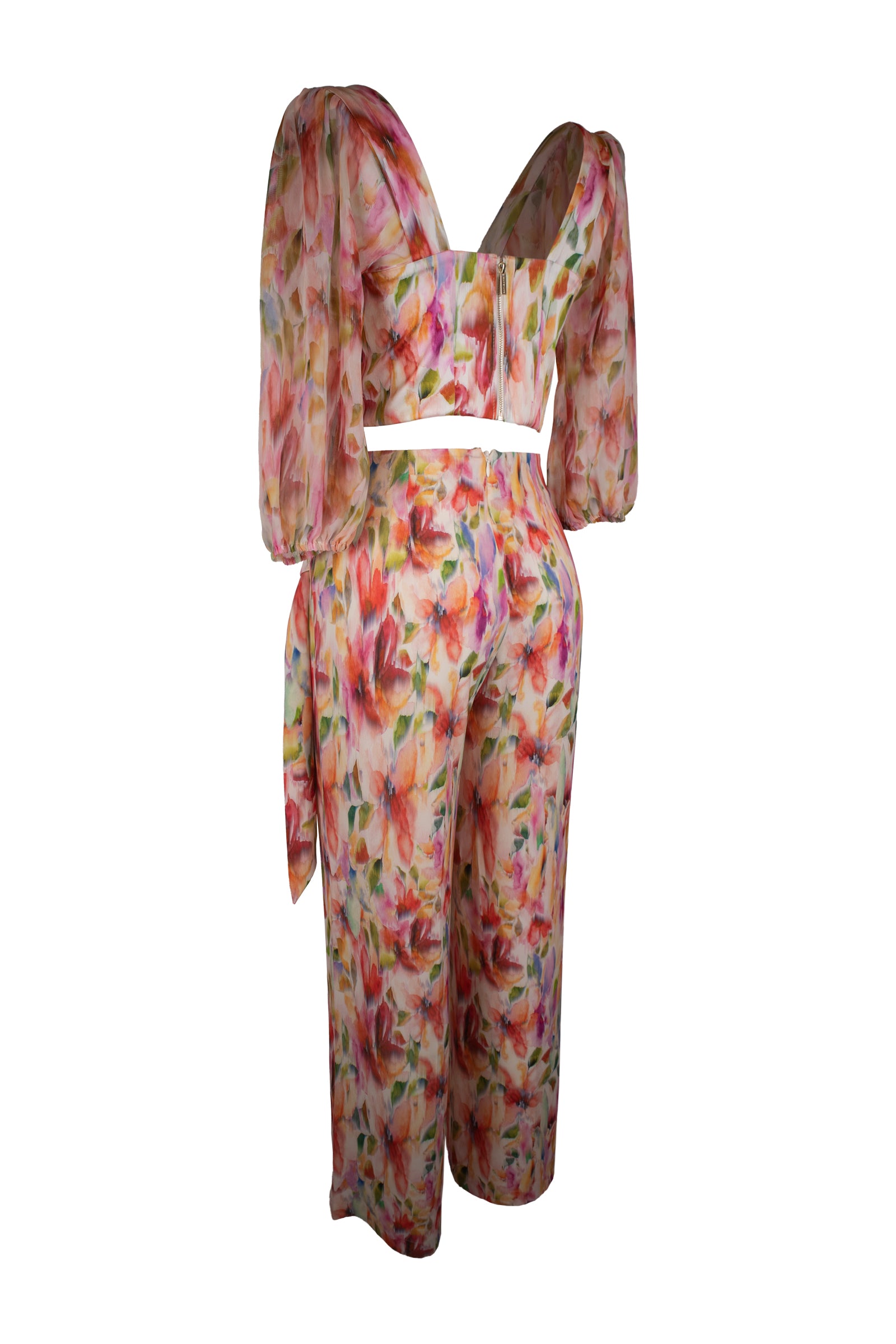 Marciano Floral Print Two-Piece Set + structured bustier top with sheer long sleeves zipper closure at back + flowy high-waisted wide-leg pants with a waist belt tie detail